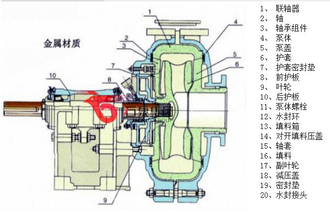 渣浆泵材质:HH型渣浆泵的泵体具有可更换的耐磨金属内衬,叶轮、护套、护板等过流部件均采用高铬耐磨金属。